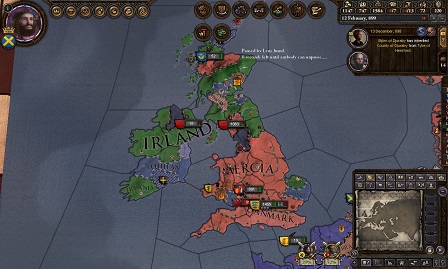 その結果、領土は上図のように拡大した。我がマーシアはイングランドの大部分とウェールズを治めるブリテン島でも屈指の勢力になったのだ。 しかしながらデンマークがウェセックスの征服に成功したことにより、イングランド南部に広大なデンマーク領が誕生してしまった。 現在マーシアの治めるのはイングランド王国De jure領域の48パーセントである。 あと1つプロヴィンスを得ればイングランド王に即位できるのだ! ならば話が早い。何も勢いにのるデンマーク王とわざわざ戦う必要などないのである。