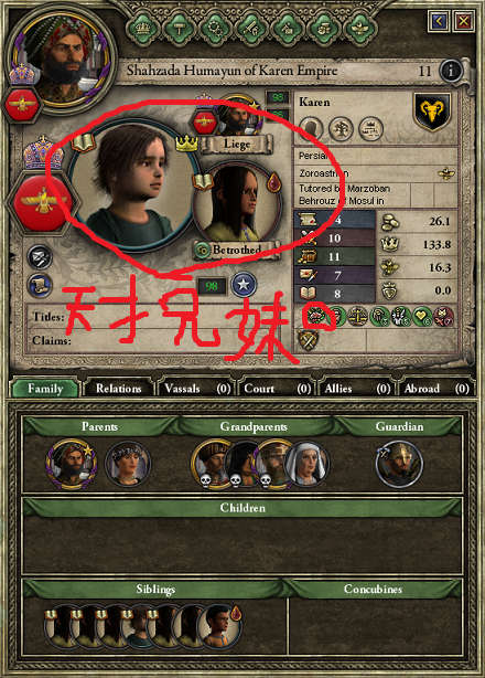 解説を入れますと、サイイドとは預言者ムハンマドの男系子孫のみに与えられる特殊なtraitです。このtraitを保つ場合、ムスリムからのオピニオンが+10されます。 ただしお互いにイスラム教である必要があるので、ゾロアスタープレイの今回は効率面での意味は特にありません。 しかし筆者がこのAARを始めた動機でもあるため、是非ともカレン家の血筋にサイイドを取り込みたいと思います。