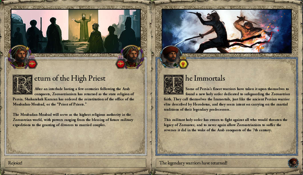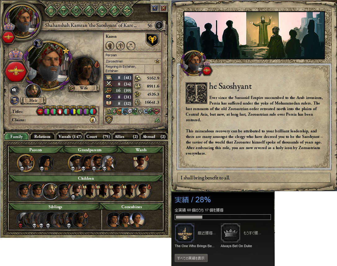 カリフから領土を回収し続け、ビザンツの内戦に介入。 時にエジプトやハーシム家を殴りながら、サイイド未成年男子の改宗に務めたKarmanは、治世の晩年に自らが救世主であることを宣言することを決意しました。 サオシュヤントの条件はペルシア帝国ダジュール内の"完全な"支配なので、独立男爵などの見落としに気をつけましょう。