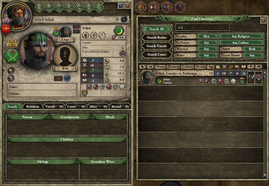 ところで。 トルコ文化の伯爵領以上に登場するということから、ならばトルコ文化の伯爵を根絶すれば良いのではないかと思った方もいるのではないでしょうか? 筆者もそう思っていたのですが、そう甘くはない様です。 だって今回のセルジューク……トルコ人傭兵のところに湧いていましたから(爆。 それでは滅ぼしようがありませんよね。 英語フォーラムでは、トルコ以外の文化になってその文化の宮廷に現れたという報告もあります。 登場自体を防ぐのは無理なので、事前に消す場合は数年に一度は人物検索を怠らないようにしましょう。カレン家プレイするなら、大体直撃される位置ですので……