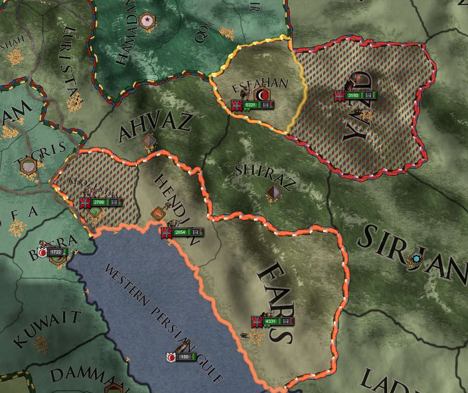 933年には、青枠のようにアッバース朝を四分五裂に追いやります。 これにより4~5公爵領分の兵力が無駄となると同時に、こちらはバグダッド周辺などの豊かなメソポタミア地域を獲得。 アッバース朝は当主の低外交力が災いしてか、近隣勢力と順番に殴りあっており、旧領を恢復する力はもはや無いに等しいです。カレン家の動員力は20000を越えました。