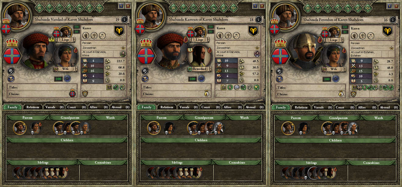 一族に領地はまだ配らないため、部屋住み&子供ができにくい状態ですが、この男子数ならば断絶はそうそう無いでしょう。 ゾロアスター教の近親結婚システムはブリーダープレイに向いているため、あえて宮殿に一族を囲っておく意味もあるとは思います。