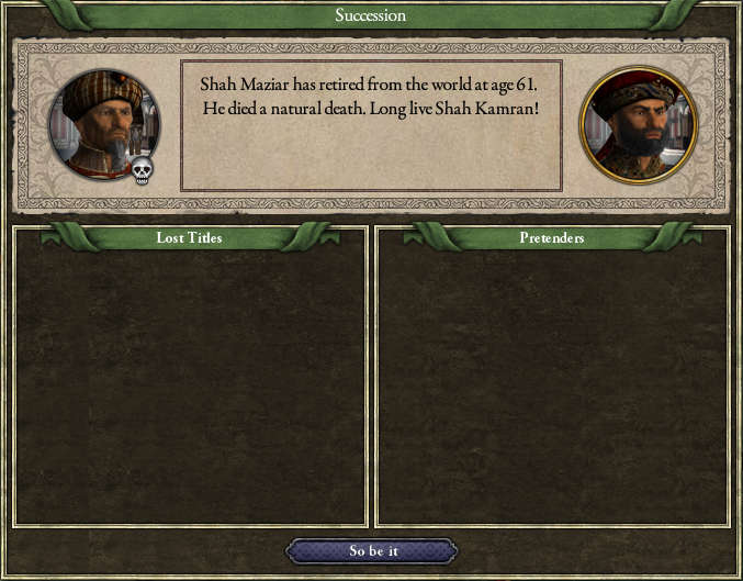 後継者指名は二転三転しましたが、これがMaziarの最後の仕事となりました。 Maziar王、938年に61歳で崩御。実に57年もの長い治世を異教徒との聖戦に身を投じ、ペルシア帝国復興の流れを確実にした彼の墓標には"敬虔なる者"の尊称が刻まれました。