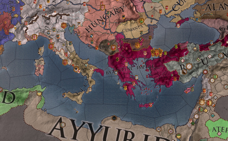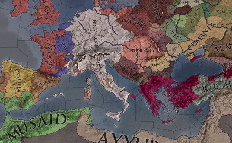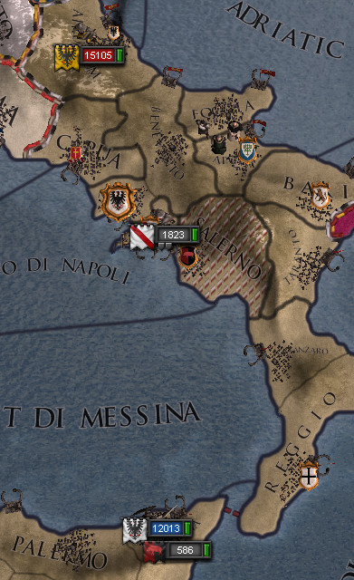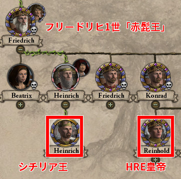 ウ: 直轄領1? シ: そう。彼は首都のナポリを抑えているだけ。 ナポリとアブルッツォ以外はオートヴィル家の公爵が治めているわ。 前国王アルマン様もカプア公として2プロビを所有。 ウ: まあでも、これから領地没収の嵐が吹くだろう。 シ: そうかもね。 ただ…、史実でもオートヴィル朝は神聖ローマ帝国に滅ぼされたけど、史実と大きく違うのは、神聖ローマ皇帝がシチリア王を兼ねていない、ということね。 神聖ローマ皇帝とシチリア王は従兄弟の関係よ。