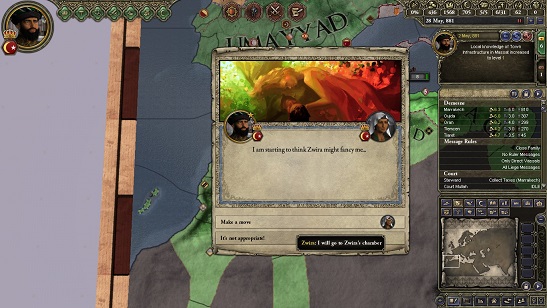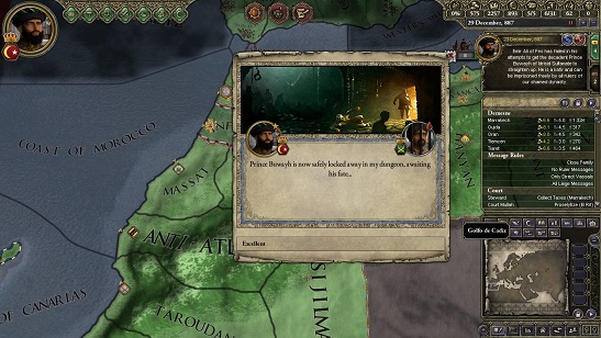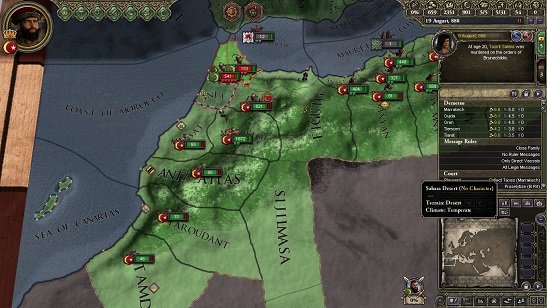 結局俺っちはTangier公位と伯領1つ王に剥奪されちまった…。しかも今後は王太子のAl-Qaismの野郎がTangier公になって俺っちはその下につけだとよ!絶対許さねぇ!! 今回の内紛を調べるためにウマイヤ朝からお前が俺っちの所に送られてきたのも何かの縁!お前にここ最近の王国に起きたことを全てぶちまけてやるから感謝するんだな!
