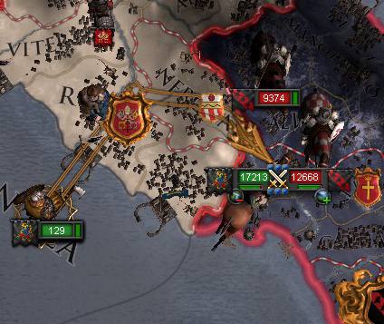 3月12日、ボヤーノから敗走する叛徒軍を追撃した帝国軍は、新たな敵軍の襲撃を受けた。 皇帝は海上の1万4千を急ぎ向かわしめ叛徒を撃滅せしめ、敵将ベッカ伯を捕えた。 016.jpg