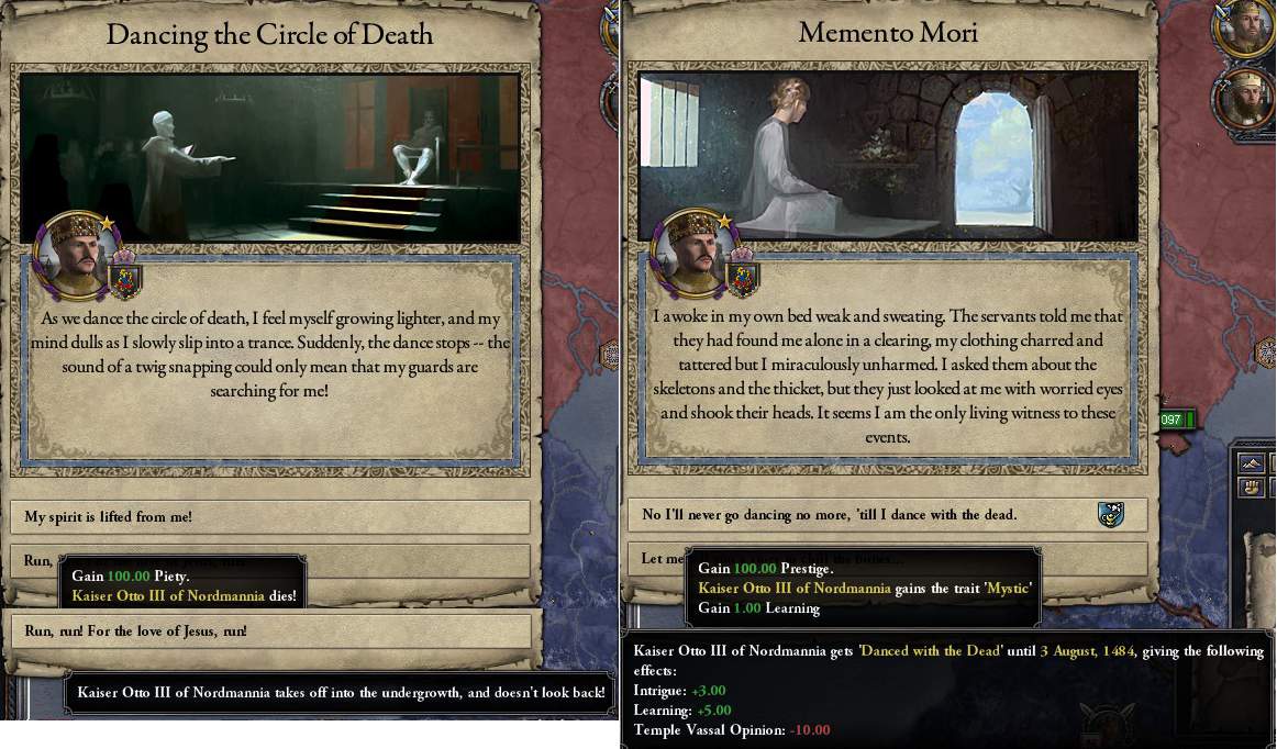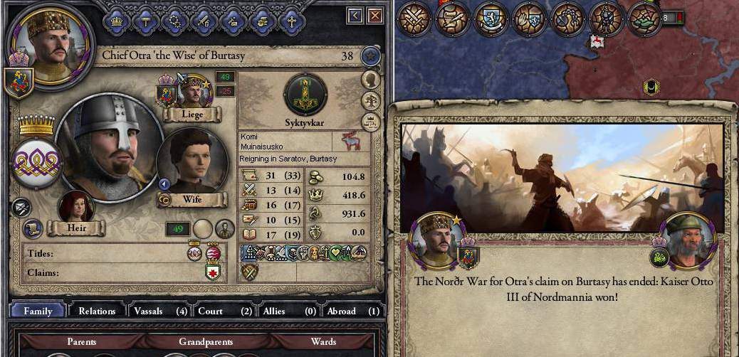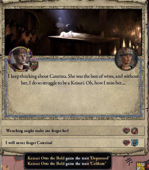9月23日、モルドヴァとモラヴィアの王、ホルスティーンの公爵プリドビョルンが薨去した。83歳の大往生であった。 ヴァルデマ聖帝以来四代にわたって仕え、帝国元帥として代々の皇帝を大いに支えた。 王位と公位は孫のプリドビョルンが継承した。 &ref(): File not found: "006.jpg" at page "AAR/デンマーク年代記/巻十六 オト大胆帝 1473~1487";