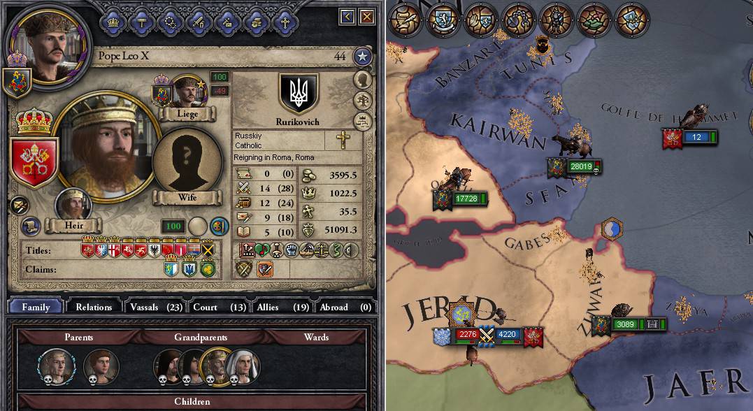 1481年2月20日、皇帝はヌビア王位は先王マルツォフィロスの第一子ザカリアスではなく、第二子デーヴィズが継ぐべきであると詔しエジプト王ヨルンを将軍として撃たしめた。 また、シノペ伯領のみとなったカンダル朝を滅ぼすべくハリィーチ=ヴォリン王ヴィエリツラウを将軍として軍を興した。