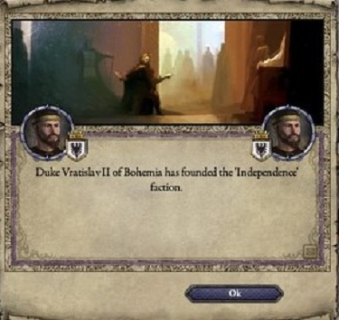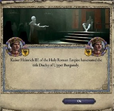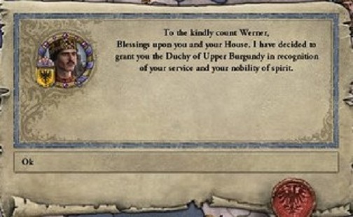 私の気心のおける部下たちは皇帝にそのことを奏上してみてはどうかと提案してくれた。さすがにそれは不遜であると断ったよ。 しかし、一度夢見ると思いは日増しに強まるもの。 公爵になりたいという願望を抑えることはできず、1072年9月末、私は上ブルグンド公爵位を求める奏上文を都へ赴く使者に託した。 10月初めに皇帝より返答が届いた。