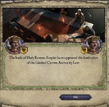 これにより、我が領地アールガウは上ブルグンド公爵の管轄下に入ったのであった。 上ブルグンド公爵として中央からどのような人物が派遣されてくるのだろうか・・。田舎の一領主にしか過ぎない私は不安で一杯であった。 しかし、私の不安をよそに、皇帝は当面は上ブルグンド公爵位を自らが兼任することを発表した。 私は安堵するとともに、可能ならば私が公爵になりたいと思ったものだよ。 だって、中央にいる皇帝よりも地域の実情を理解している地元の人物が公爵になった方が統治は上手くいくだろ?
