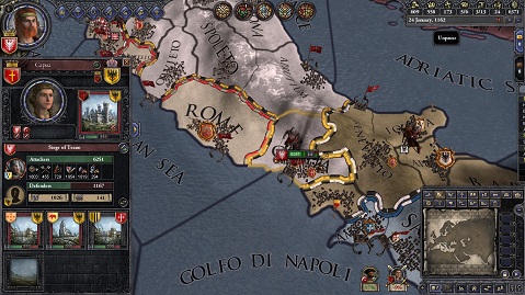 混乱状態にあったシチリアは周辺勢力からの宣戦布告や相次ぐ反乱により兵力を大きく減らしていた。 たった1公爵の兵力でも余裕で倒せる相手だったのさ。 シチリア王軍およそ2000を破った我が軍は王都アプリアを包囲した。
