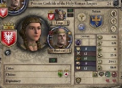 そもそも、いくら公爵夫人だったとはいえ先代との間に子のないよそ者のこの女が如何にして我が上ブルグンド宮廷にて力を強めていったのか。 この女の権力基盤は実家にあった。この女狐、たちが悪いことに皇帝の娘だったのだ。