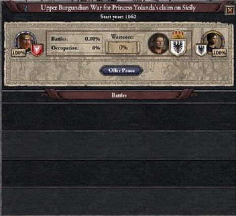 1162年末。我が妻ヨランダをシチリア王に就けるべく、シチリアに宣戦布告したのだ。 当時シチリア王位にあったのはセルビア人の幼女。 いくら祖母が先々代王の姉だとはいえ、正当性は皆無に等しい。 シチリア王国は誇り高きノルマン人の築いたオードブィル家の国だ。セルビア人の女王よりも先々代の末妹であるオードブィル家一族である我が妻の方が相応しい。 今こそ正当なるオードブィル家の女王を迎え、シチリアは混乱から立ち直るべきなのだ。 もっとも、シチリアを今の混乱状況に追い込んだ黒幕は我がハプスブルグ家なのだがな!