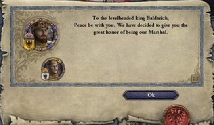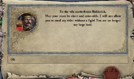 ワシはバルダリッチ。王の寝所を監視させていた部下より、先ほど王が死んだという報告が届いた。フハハハハ、男爵上がりのエメリッチよ、しょせん貴様には王など荷が重すぎたのじゃ。 これで、晴れてワシが王じゃ。法によってこれは決まっておることなのだから誰も異議は挟めぬぞ。たとえそれが皇帝であってもだ。