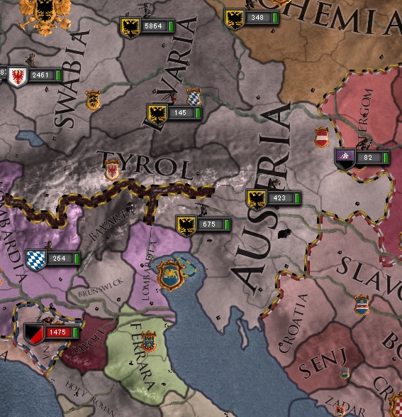 レオポルトは31才。治世は安定しており、バイエルン王国再興のためにあと1州という状況も変わっていない。  しかし、この治世には一つだけ不安材料があった。妻エリスカとの間には既に4人の子を設けていたが、すべて娘だったのだ。  オーストリア公爵家の相続法は伝統的に準親族制を採用しており、男が産まれなくても相続に問題はないが、その場合は長女の婿として 迎える相手は慎重に選ぶ必要がある。  レオポルトと家令アルヌルフは頭を悩ませるのだった。