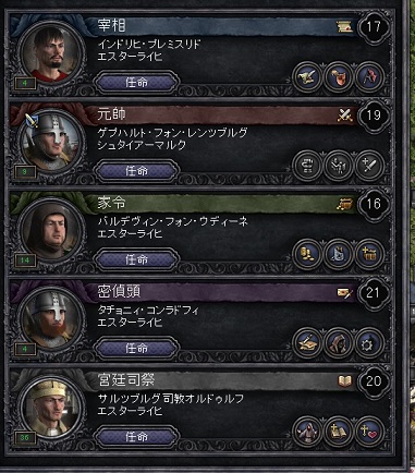 宰相は、先代から務めるインドリヒ・プレミスリド、39才。 元帥も、先代から務めるゲプハルト・フォン・レンツブルク、39才。 家令は、ローター即位後に招聘したバルデヴィン・フォン・ウディーネ、31才。 密偵頭には、ハンガリー王国から招聘したハンガリー貴族のダチョニィ・コンラドフィ・アルパド、19才。 アルパド家は代々ハンガリー王を輩出してきた家系であるが、ダチョニィはニトリア公爵の家系であった。 宮廷司祭には、反乱を起こしたザルツブルク司教の後を継いだオルドゥルフ、37才。