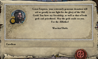 この状況が、インガの国内統制に非常に好都合だったからである。 インガは戴冠して間もない女帝であり、家臣達からの信頼が十分であったとは言い難かった。しかし、「キリスト教徒の侵略を受けている」という状況はスカンジナヴィアのノルドの結束を多いに強め、それがそのまま彼女への求心に繋がっていたのである*2。 インガはこれを利用して国内に積極的に「キリスト教徒の脅威」を宣伝し、民会に更なるの帝権・王権の拡大や、それまで免除されていた族長達への課税義務など、無数の法案を通し続けた。加えて、十分な占領を進めた後には軍をゼーラントで一時休ませ、そこから中フランク内のあらゆる富を搾り取らんと略奪を開始。スカンジナヴィアの国庫は膨大な略奪品と身代金で溢れ返り、これを投じて国内施設の充実も進められた。この時にインガによってランダースに創立されたスカンジナヴィア初の大学は、今日も「ユラン大学」として北欧知の最高峰で有り続けている。