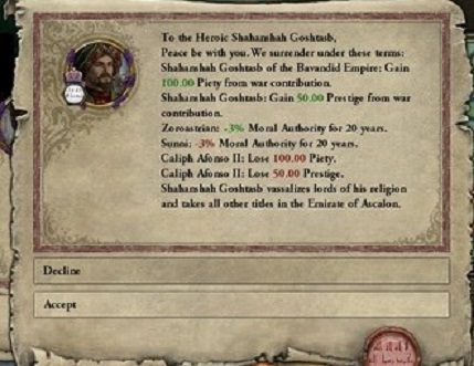 そして、戦の開始から2年経たない間に戦勝点は100となり、アッバース家はアラビア帝国にBasra一帯を割譲することを余儀なくされたのであった。