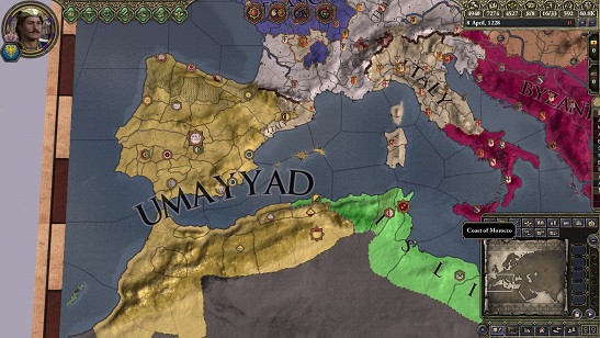 ウマイヤ朝ヒスパニア帝国がイベリア半島をほぼ統一しており、一見すると大正義になっているように見える。 しかしその内情はボロボロで、相次ぐ内乱と強引に進めた中央集権化政策により統治が全土に行き届かない状況(封臣制限オーバー)にあり、確実に衰退に向かっている。 イタリア王国がバルセロナ地方を領有している。この世界のレコンキスタはイタリア主導で行われるのだろうか。
