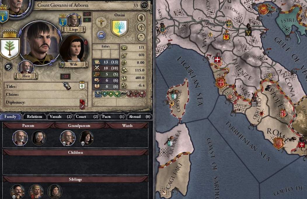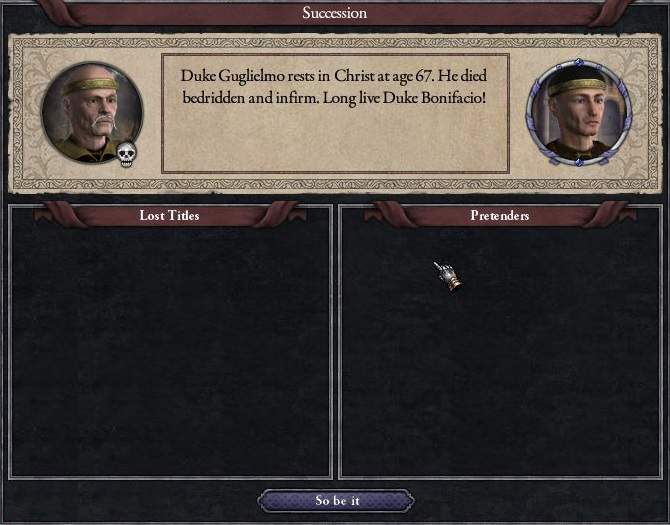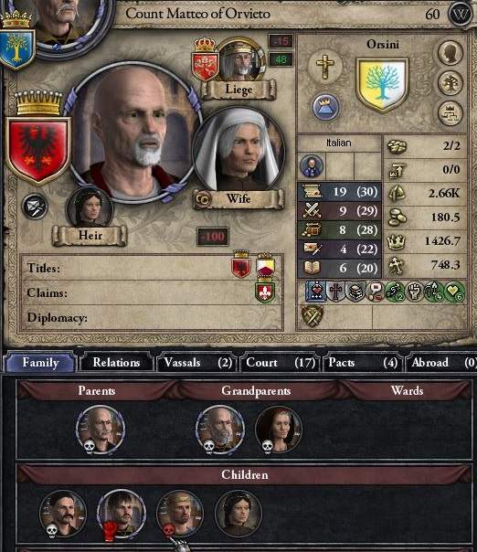 教皇領の世俗領主、オルヴィエート伯家の次男・ジョバンニは、「明敏」かつ「美貌」と恵まれた特性を持っており、 それを見込んで、グリエルモの四女の婿として女系結婚で貰ってきていた。 32年時点で孫は産まれていないが、まだ夫妻共に20代半ば、まだまだ子宝の可能性はある。 ジョバンニは次男であり、オルヴィエート伯家は長子相続制。よって継承には関係なく、試しに見てみた長男への暗殺plotも32%程度……だったのだが、 あるときふとチェックしてみると、長男が病死していたのだ!*1