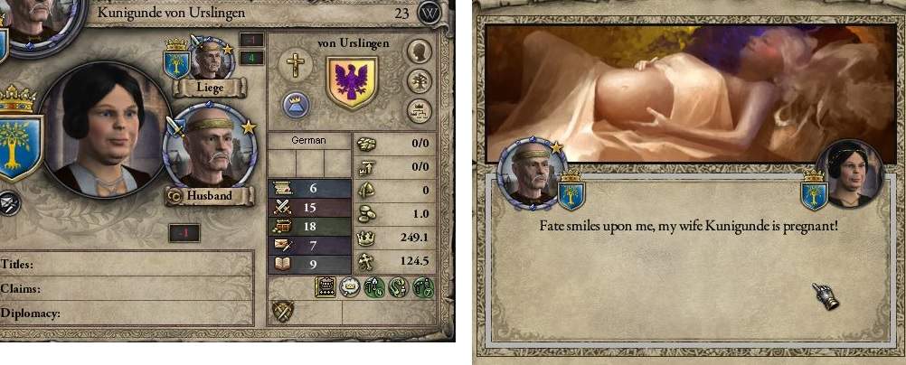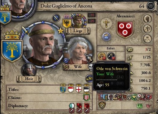 64歳でinfirm持ちのグリエルモより先に、55歳の嫁が死ぬとか。ウッソだろおい。 明らかに老い先ごく僅かなはずだが、嫁無しでは直轄領2つしか維持できないのは辛すぎるので、 すぐに管理の高い嫁を新たに連れてくる。年齢とか考えず、とにかく一番管理が高い娘を選んだら、24歳公爵家の息女だった。これで3人目の嫁である。