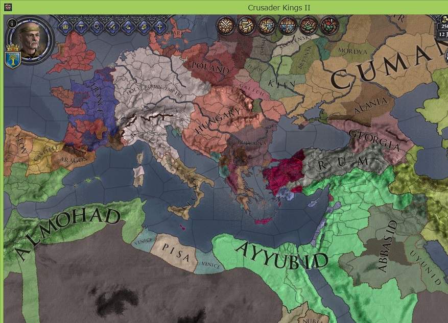 イスラム教圏も、西方のムワッヒド、東方のアイユーブ共に盤石を保っている。 特にアイユーブは総兵力30000を数え、本気になれば東方正教を滅ぼすことも可能だろう。怖い。 また、ルームセルジューク朝がトレビゾンド専制候を叩き潰し、黒海岸を領有している。 なお、アレラミチ家のエルサレム王国は、アレラミチ家が断絶するどころの話でなく、キプロス公国に継承で乗っ取られてしまっている。 キプロス公の次男がエルサレム女王の婿になったのだが、長男がどこかで何かして死んで、次男がキプロス公・エルサレム王両方を継承した……ということのようだ。