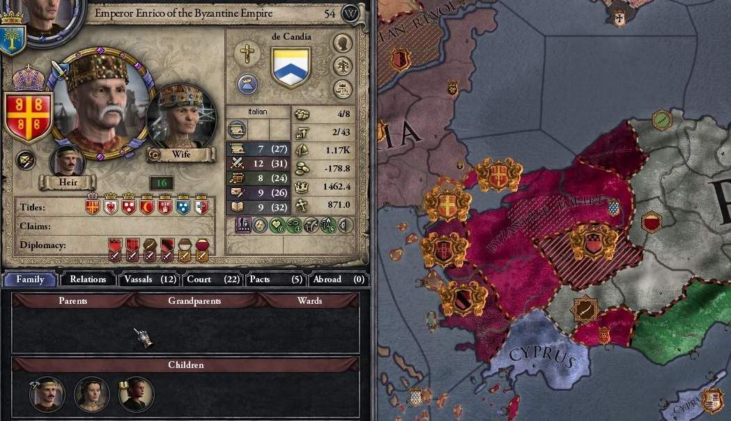 ラテン帝国は初期配置イベントスポーン兵が消耗しきり、ビザンツの攻勢に耐えられなかった模様だ。 またブルガリアにも領土を削られており、建国30年既に半死半生の体となっている。