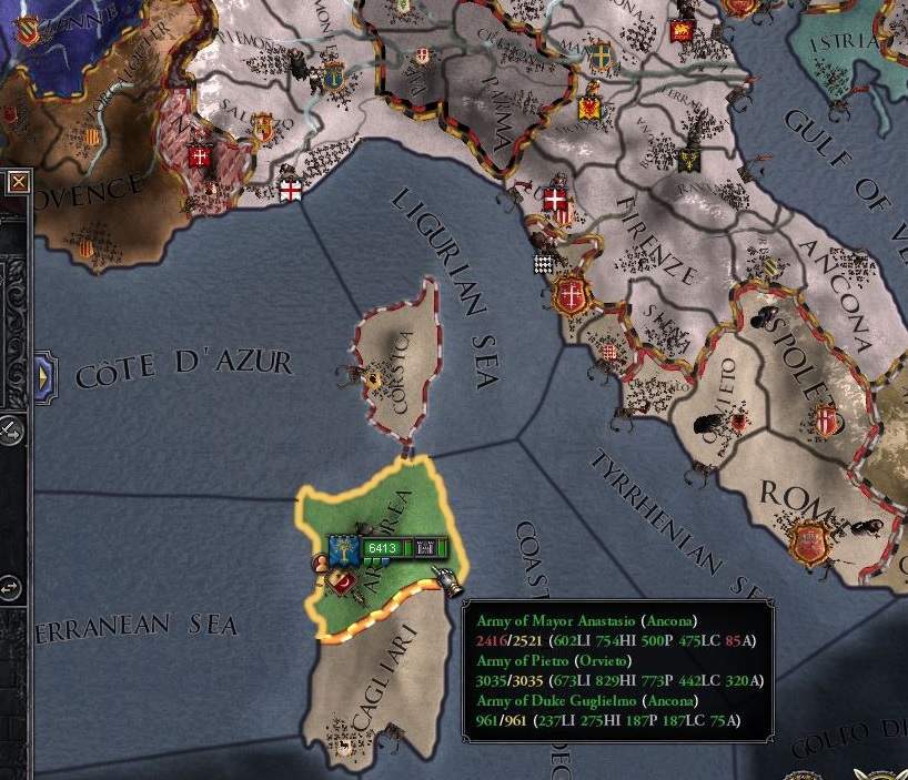 戦勝点は70点近くまで来たものの、我がアンコーナ公軍だけでは6000の敵は到底排除できない。 同盟者であるオルヴィエート伯軍は壊滅状態で、フランス軍はしばらく帰ってこない。 どーすんべ・・・と頭を抱えていると、あることに気づいた。