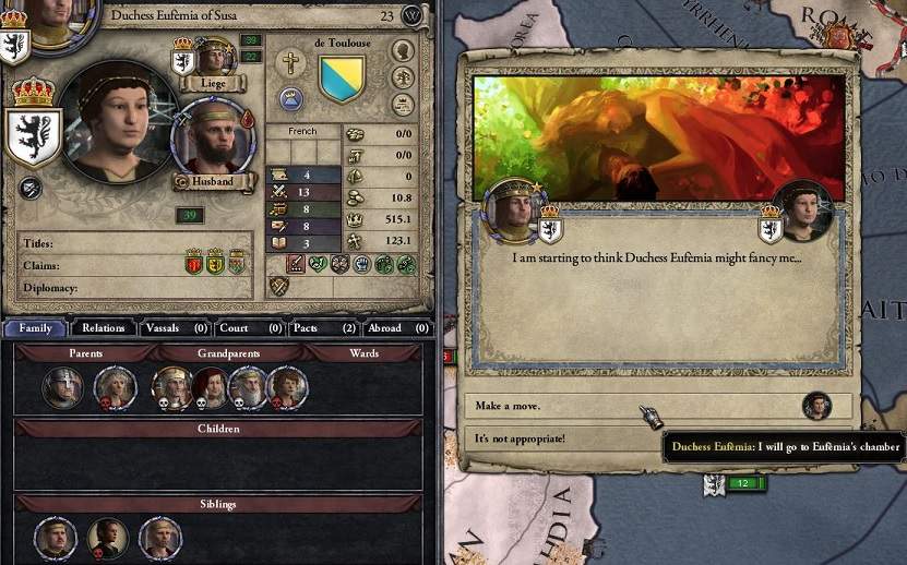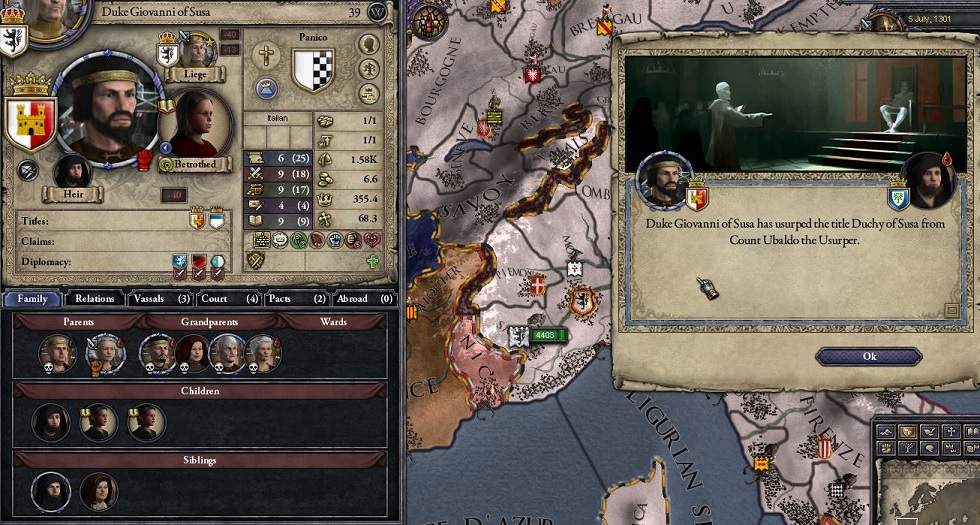 簒奪者は、あの女傑サルデーニャ公アマーリアの嫡子。直前まで領地は持っていなかった。よって私戦ではない・・・というかさすがに気付く。 ちょっといったいどういう挙動でスーザ公位があっちへこっちへ飛んで行っているのか全く分からないのだが、 起きてしまったものは仕方ない・・・なんだろうなぁ・・・