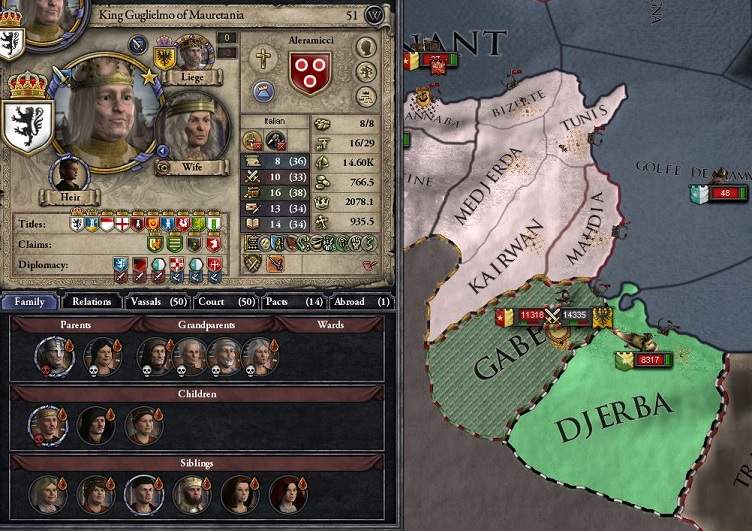 実は95年、ムワッヒド家がチュニジアに唯一残していた拠点・ガベスを狙い、帝国本体が聖戦を布告。 これに対応し、最大動員力40000を誇るイスラム圏最大最強国家・アイユーブ朝がムワッヒド側に立ち参戦、 北アフリカで、上のSSのごとく、万単位の軍勢が行き交う悪夢のような戦いが5年ほど繰り広げられていたのだ。