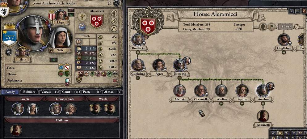 ところで、彼は本AAR開始時のモンフェラート伯・初代アンコーナ公グリエルモの甥にあたる。 十字軍戦士にして初代テッサロニキ公ボニファーチョ→次男・「鉄壁」デメトリオ→三男・アンセルモ、と、 アレラミチの血筋を男系で繋げているのは彼の系統であり、血縁関係も近い。 また2代アンコーナ公ボニファーチョがその死の間際に残した長男は、女児2名を残して早世しており、 テッサロニキ公ボニファーチョの長男・グリエルモ系の男系は絶えている。
