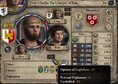 元々グリエルモとウバルドは、スーザ公のde jure内であるモンフェラート伯領の帰属の関係から、関係は良くなかったが、この一件で両者の関係は完全に破綻。 「寝取られ男」補正でオピニオンは怒涛のマイナス100近くまで落ち込んだ。