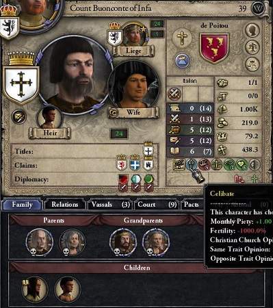 こう書いた家だが、実はこの後、エピルス公58歳にして跡継ぎの男子に恵まれていた。 やむなく男子を暗殺しようとするも、plot powerが全く足りず、我が家臣による継承は見事御破算となっていたのだ。