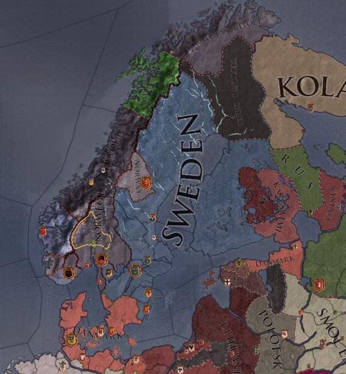 その後もノルウェーでの混乱は収まらず、公爵級領主が王位を求めて争い合う悲惨な状態になった、というのが上の地図である。