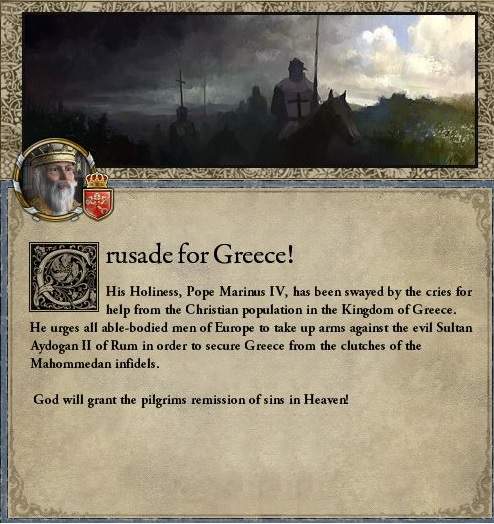 史上最大の十字軍は、迎撃に出てきたイスラム軍25000を文字通り一蹴、暴力的な物量で各地を速やかに占領し、完勝を掲げた。 戦功第一としてギリシャ王座を神に認められたのは・・・