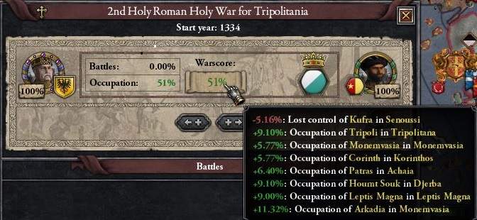 4領を一挙に奪い去り、ヴェネチアに致命傷に近いダメージを与えた。この後、ヴェネチアの軍事行動は一気に鳴りを潜めることになる。 これでまた封臣上限が溢れたため、今度はチュニジア公を作成。5スロットの直轄領チュニスを除いて公に管轄を移した。