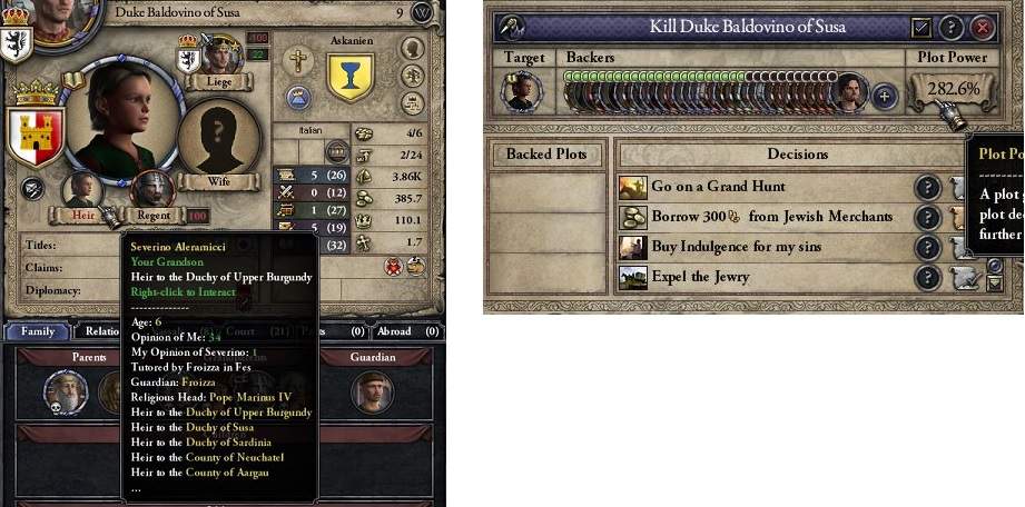 継承者の欄に、当時6歳の、ルイージ大王の長男の長男=直系の孫の名前があることを確認し、暗殺Plotを続行。*2 9歳にして公爵になってしまったことで、Plotに参加可能な人数が圧倒的に増えたこと、陰謀値や外交値が9歳相応のものになってしまったことなどから、 Plot Powerは従前の100%前後から、一挙怒涛の300%突破。 少年はたちまち永遠の眠りに付くことになった。