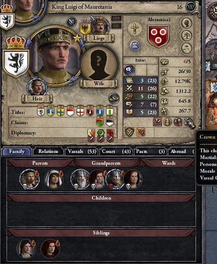 モーリタニア王ルイージ1世は、若干12歳で即位した。 12歳時点で「5」を超えているステータスが無く、はっきり言って将来を危ぶんでいたが・・・