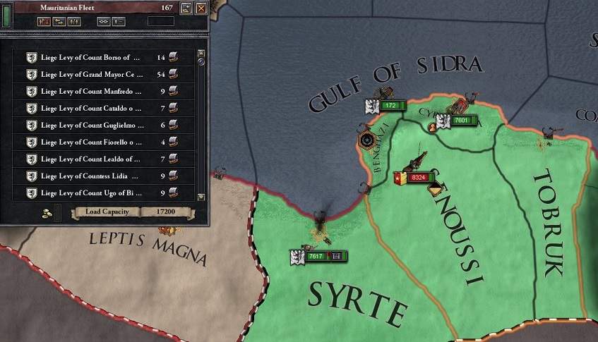 14年5月、王国総動員によって徴集された全軍がキレナイカに展開。 補給限界値が10000を切る土地ばかりということもあって二軍に分かれ、海上機動で援護し合える位置取りで、攻城戦を開始した。