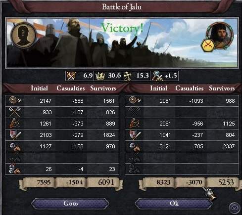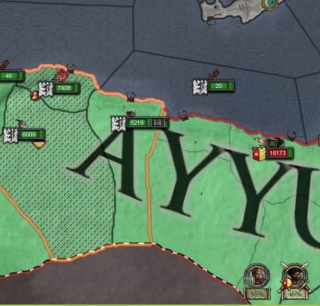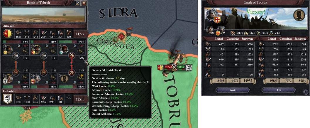 アビシニア軍が紅海沿岸で暴れ始めるのを見つつ、こちらも傭兵隊を一部隊雇用し戦場へ展開。20000の兵を3分割して占領に当たる。 もう一度くらいは野戦があるだろうと、城の強襲は避け、地道に攻囲で戦勝点を稼ぐ。と。 1315年5月、再編を終えたのかアイユーブ軍16000が進撃してくるのを確認。 全軍を集結させると数でこちらが勝り、敵が攻撃してこなくなる可能性があったため、 トブルクにいる傭兵隊を囮に、敵が攻撃→後方から増援→数の差で押しつぶす という展開にしようと決断。