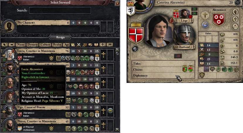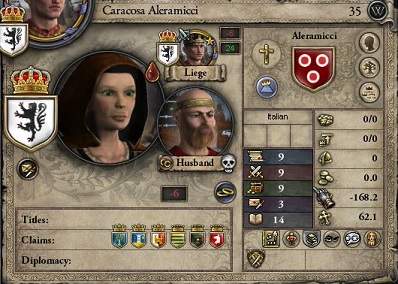 カテリナ・アレラミチ。「天才」持ちで陰謀23を誇る、凄腕のスパイマスター足り得る人材。 だが、AIの有り得ない結婚によって、他家の無名のcountの嫁になっている。信じがたい。