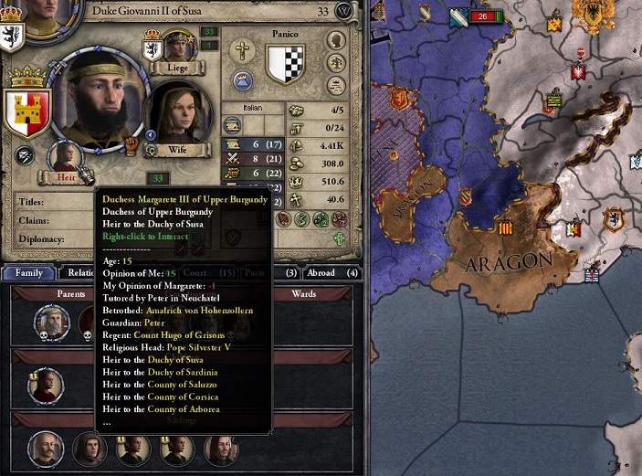 スーザ・サルデーニャの公、パニコ家のジョバンニ。3つの伯号と1つの男爵号を持つ、王国最大の貴族。 彼は何故か女系結婚しており、その相手は上ブルグンド公家の息女であった。 だが、例のペスト大流行に伴って上ブルグンド公家に死者が続出、死屍累々の末、 まずはジョバンニの妻に、それもすぐ死んで1人娘に、公位が回っていってしまったようなのだ。