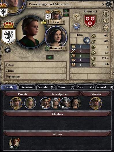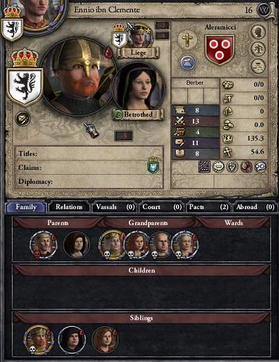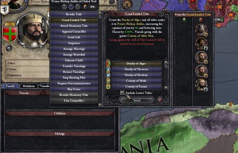 家庭と血統の話がずいぶん長くなってしまった。いい加減プレイに入ろう。 まずは相続した称号の始末だ。現在、「モデナ」「トレムセン」「アルジェ」の三公位を保持しており、 直轄領も5つまでしか管理できないのに9つ所有と、色々溢れかえっている。