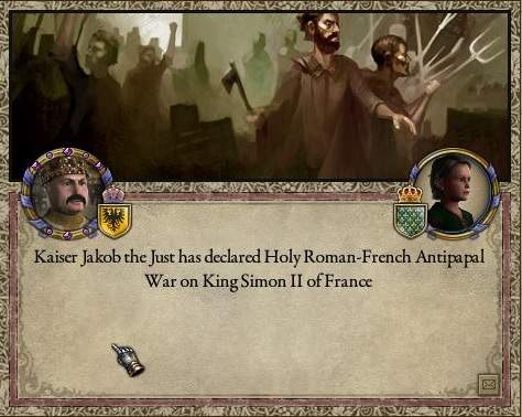 無論周辺諸国は激おことなるかと思いきや、フランスの動員兵力30000に恐れをなしたか、諸国どこも喧嘩を売りに行かない。 が、1310年、アフリカで無益に続いていた聖戦の痛手からようやく立ち直った我らが皇帝が、フランスに宣戦すると、 たちまちイングランド・アキテーヌ・カスティリアが個別に対仏宣戦、さらに教皇領が皇帝側に立ち参戦とかいう、 美しいまでのフルボッコ劇場が開催され、対立教皇はあえなく10年余りで廃立・破門となった。 フランス君の体を張ったギャグに笑いを禁じ得ない。