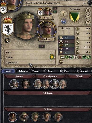 長男の婚約を整えたのち、三男(1歳)とホラント女公(5歳)の婚約も成立。次男は2歳で病死した。 ホラント公家はネーデルラント一帯の他、フェラーラ近郊の司教領2ヶ所を持っており、 上手くすれば、次代で一気にモーリタニア王の境域を広げられるかもしれない。 ペストで死人が出まくったおかげだろうか?