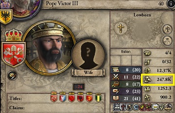 教皇Victor III世の資金は247,800と莫大なものである。 資金1あたり約40の傭兵を雇えるので、(実際にはそれほどの傭兵団は存在しないが、)1000万もの大軍に相当する。