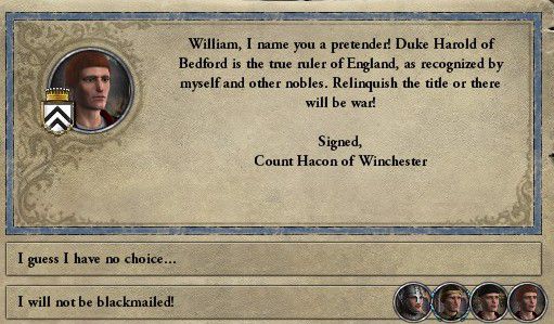 a_william2.jpgうーん。どうしたものかなぁ…。 knight.jpg陛下、何やらお悩みの様子。私でよろしければお伺いいたしますが? a_william2.jpgうむ、先の反乱でアングロサクソン人家臣の所領を召し上げる事に成功した。 だがまだまだ叛意を持つ有力家臣はいる。ベッドフォード伯ゴドウィン等だ。何とかして弱体化させる方法は無いものかと思ってな。 knight.jpg批判を恐れず没収という手段もございますが…。 a_william2.jpg他の家臣に動揺が走る。それは論外だろう。 knight.jpgでは陰謀で賛同者を集め、その圧力で召し上げるというのはどうでしょう? a_william2.jpg現状できるのはそれしか無いか。では賛同者を集めてくれ。 knight.jpg御意!