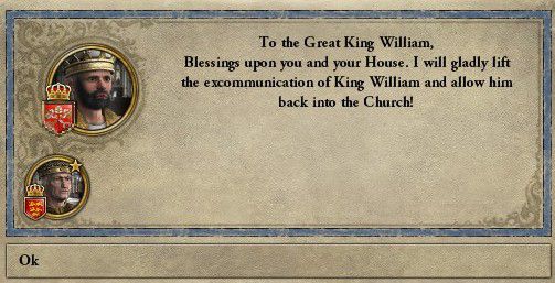 b_018.jpg knight.jpgヨーク女公の告発により、教皇アレクサンダー2世より破門を言い渡されました! a_william2.jpg孫殺しがバレたかな。アレクサンダー2世猊下と言えば、イングランド支配のお墨付きをくれた方ではないか…。 knight.jpg破門により、家臣との関係が悪化します。更なる反乱に注意が必要ですね。