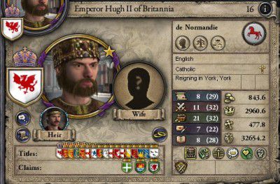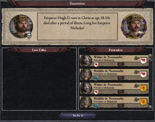 ブリタニア皇帝ヒュー2世 18才没 ブリタニア統一に向けて前進したものの、あまりに若く没してしまった 有能であっただけに非常に無念である 帝位は従兄弟のニコラスが継承します