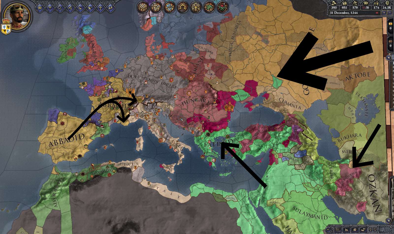 東からキプチャク・ハン、イルハンが到来。キプチャクは旧ロシア領に帝国を形成 ファティマ朝エジプトがビザンツに侵攻、コンスタンティノープル陥落 アッバード朝がイベリア帝位を創設、神聖ローマの支配していたブルゴーニュ、プロバンスを併合 キリスト教世界は確実に崩壊へと歩を進めている